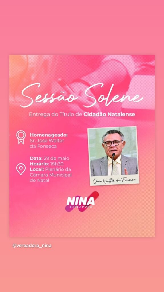 Nesta segunda-feira (29), a Câmara de Natal promove entrega Título de Cidadão Natalanese a José Walter da Fonsceca.