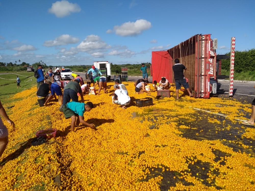 O acidente aconteceu por volta das 2h na via do acesso sul ao aeroporto. O motorista do caminhão informou que tentou desviar de um buraco, mas acabou tombando. Ele também disse que pediu aos moradores das proximidades para levarem as frutas.