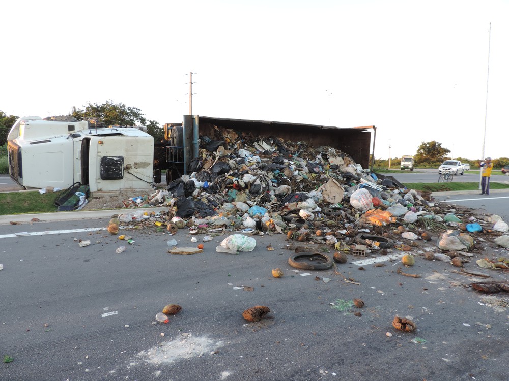 Na tarde de ontem (19), um caminhão carregado de lixo tombou na estrada que dá acesso à entrada do Aeroporto Internacional Aluízio Alves, em São Gonçalo do Amarante, Grande Natal. O motorista, que seguia sozinho no caminhão, não se feriu. Ele perdeu o controle do veículo logo após a rotatória próxima à entrada do aeroporto. Depois do tombamento, o lixo que estava na caçamba do caminhão se espalhou pela pista.