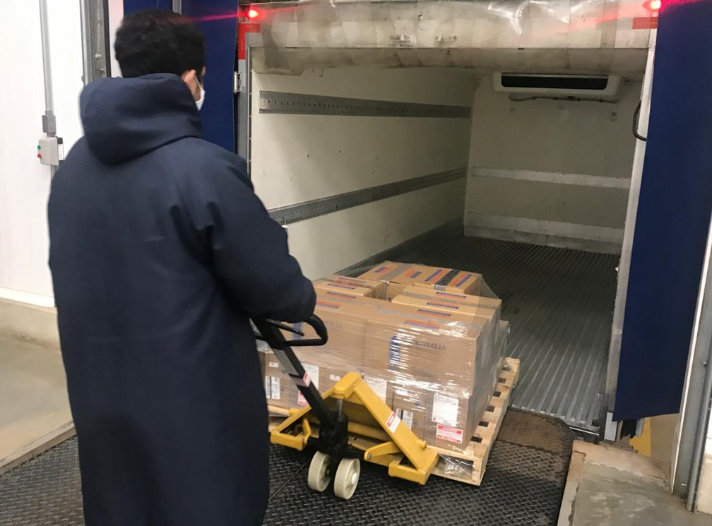 A entrega, prevista para ter início nesta terça (23), só começou a se concretizar no fim da noite. Segundo a assessoria de comunicação da Cristália, o carregamento teve início por volta da meia-noite. Equipe trabalhavam na parte burocrática, com os registros de guias de entrada e saída e emissão de nota fiscal.