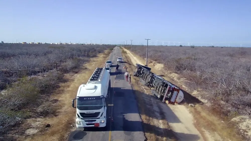 Um caminhão-tanque que transportava mais de 59 mil litros de etanol tombou na tarde desta quinta-feira (8) na RN-401, na altura da cidade de Guamaré, na Região da Costa Branca do Rio Grande do Norte.