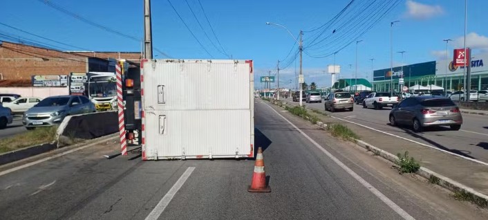 Um caminhão tombou no meio de duas faixas na tarde dessa terça-feira (15) na Avenida Tomaz Landim, na Zona Norte de Natal, e provocou uma interdição parcial na via, segundo a Polícia Rodoviária Federal (PRF). O trânsito ficou lento no trecho.