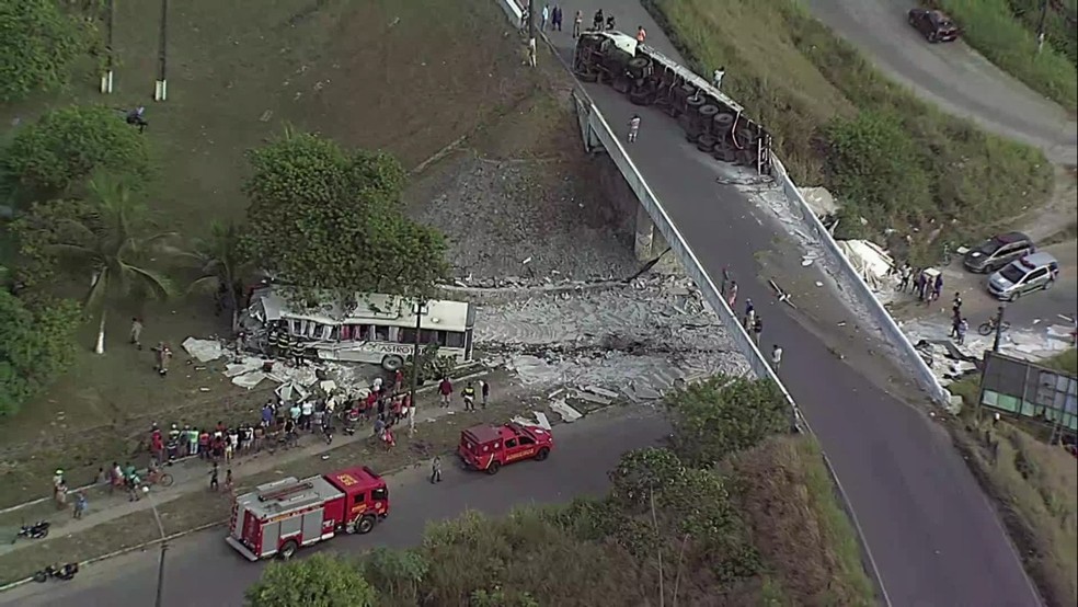 Um caminhão tombou em um viaduto sobre a BR-101 Norte, em Igarassu, no Grande Recife, nesta segunda (1º). A carga de gesso que o veículo transportava caiu sobre um ônibus que passava sob o elevado, fazendo com o coletivo batesse em uma árvore. O motorista do ônibus morreu e oito pessoas ficaram feridas, segundo os bombeiros a Polícia Rodoviária Federal (PRF).