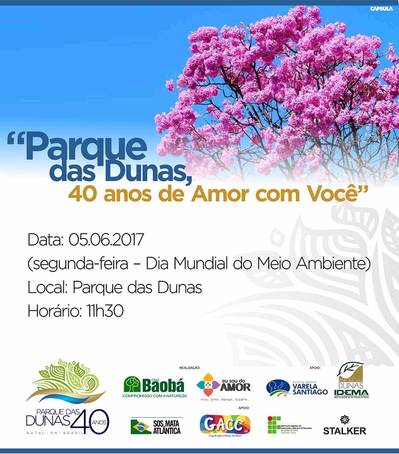 A Campanha “Parque das Dunas, 40 anos de Amor com Você”, será lançada dia 5 de junho de 2017, no Dia Mundial do Meio Ambiente, às 11h30h da manhã. Na ocasião haverá um desfile de modelos com camisetas que estampam a riqueza biológica do Parque das Dunas. As peças de publicidade foram criadas pela agência Cápsula, do publicitário Alexandre Oliveira, que soube reproduzir em imagens esse símbolo de sustentabilidade num conjunto de belíssimas artes criativas. E para registrar esse importante momento, o fotojornalista Canindé Soares assinará as fotografias do evento.