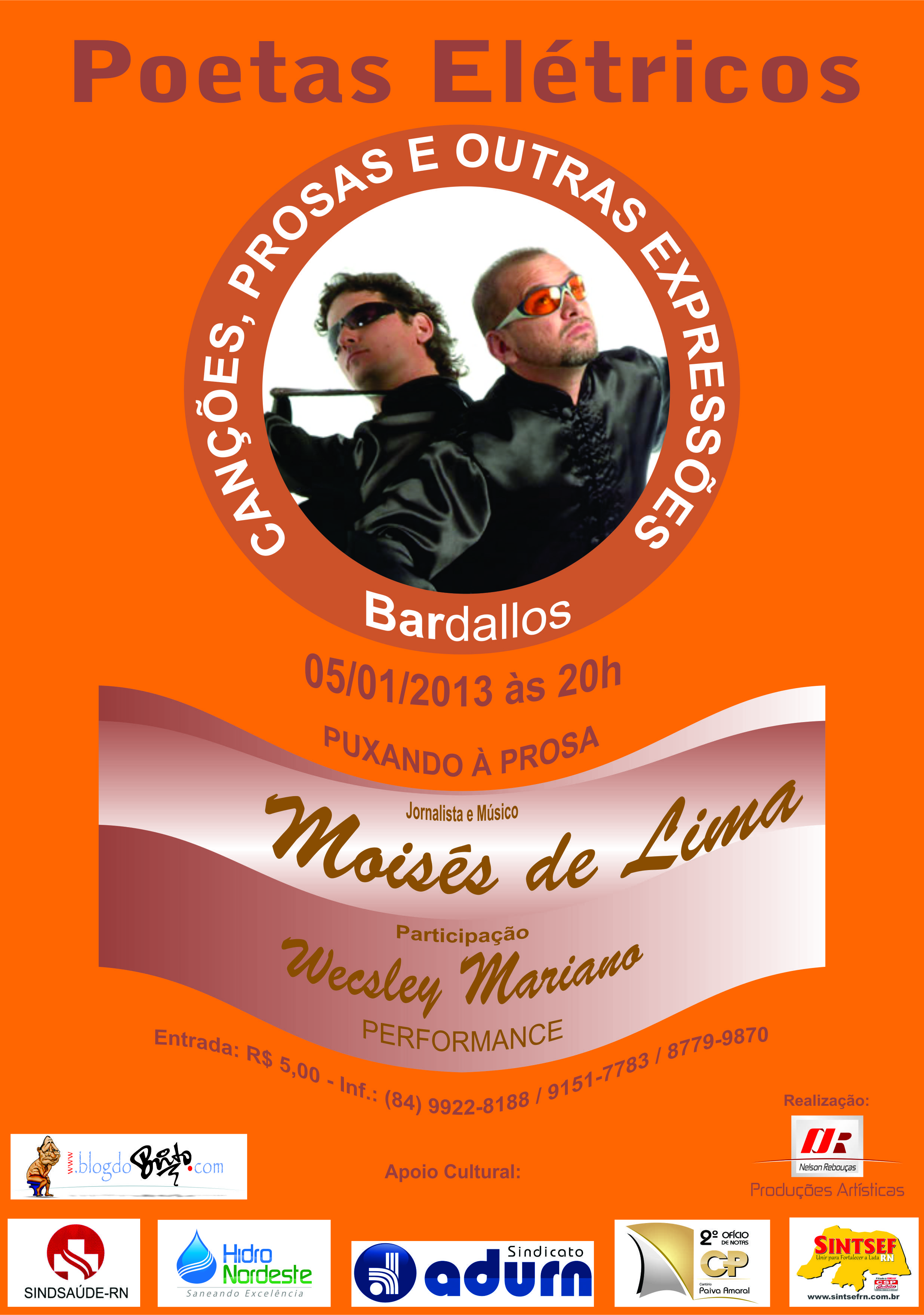 A 5ª edição do projeto “Canções, Prosas e outras Expressões”, que acontecerá no dia 05 de janeiro/2013, às 20 horas no Bardallos Comida e Arte, Centro Histórico, contará com a participação especial dos Poetas Elétricos..  A prosa será puxada pelo jornalista Moisés de Lima que também atuará como músico convidado do Duo Carito Cavalcanti e Edu Gomez. A performance de abertura da noite ficará a cargo do produtor e ator Wecsley Paiva. Mais informações: ver anexo ou contato com a NR Produções através dos telefones 9922 8188 / 9151 7783 / 8779 9870.