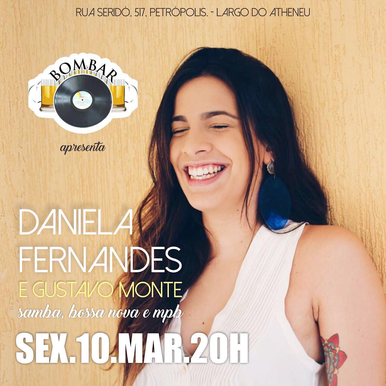 A cantora Daniela Fernandes e Gustavo Monte são as atrações musicais do bar Bombar em Petrópolis, nesta sexta-feira (10), às 20h.