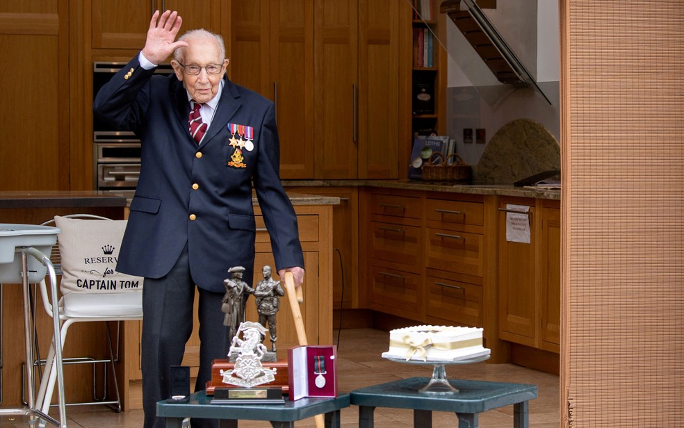 Em abril, isolado em sua casa ao norte da cidade de Londres, o capitão britânico gravou um vídeo em que afirmou que daria 100 voltas em seu próprio quintal, com seu andador, se as pessoas doassem dinheiro para o NHS.