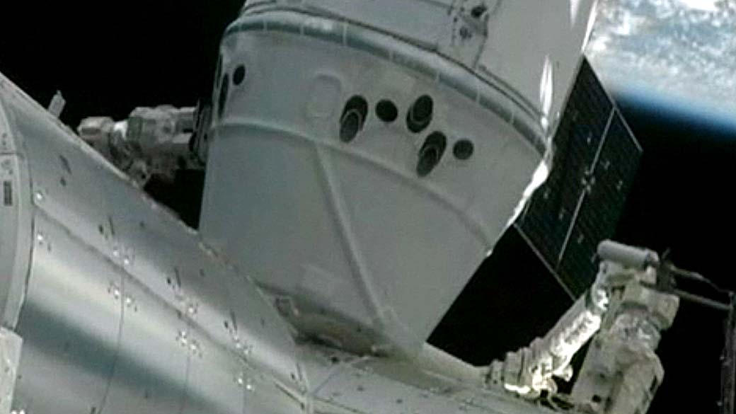 In this frame grab from a NASA video, the SpaceX Dragon capsule is seen docked to the International Space Station on May 25, 2012. SpaceX has become the first private company to rendezvous with the orbiting lab. = RESTRICTED TO EDITORIAL USE - MANDATORY CREDIT "AFP PHOTO / NASA" - NO MARKETING NO ADVERTISING CAMPAIGNS - DISTRIBUTED AS A SERVICE TO CLIENTS =