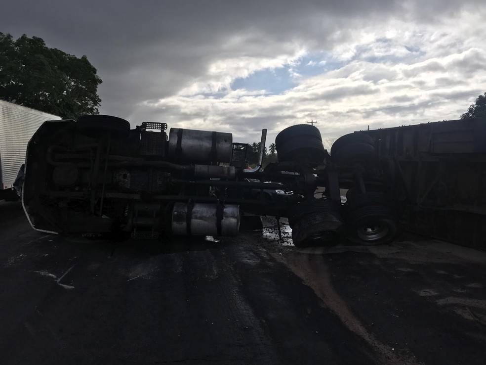 Uma carreta carregada de mangas tombou na madrugada desta segunda-feira (7) na BR-304, próximo ao entroncamento com a BR-226, em Macaíba, na região metropolitana de Natal. Ninguém ficou ferido. O trânsito da região foi desviado pelas obras de duplicação da Reta Tabajara.