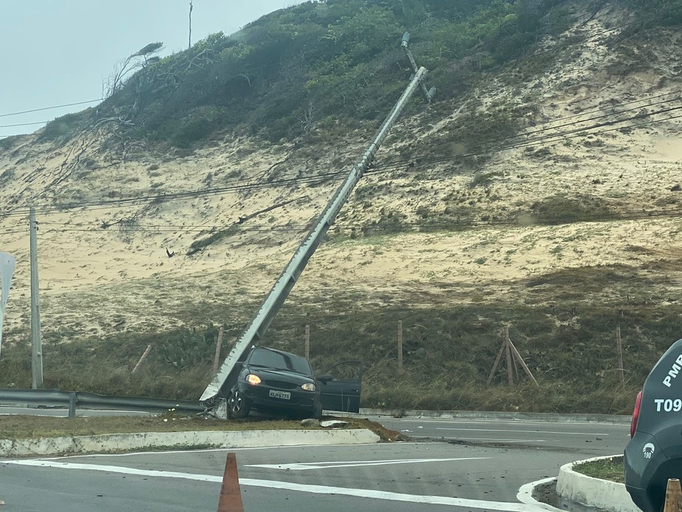 Um carro bateu em um poste na Via Costeira, em Natal, na manhã desta segunda-feira (27) e interditou um trecho da via.