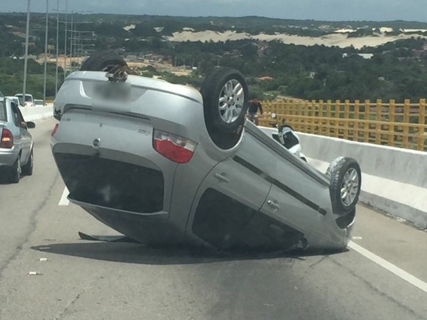 Um carro capotou em cima da ponte Newton Navarro, na Zona Norte de Natal, na manhã de ontem (12). Um veículo que vinha logo atrás perdeu o controle e acabou colidindo contra a mureta de proteção da via. O acidente aconteceu no sentido Praia do Meio/Redinha e interditou a via por alguns minutos. No entanto, por volta de 11h, parte do trecho havia sido liberado e o trânsito começado a fluir. Os ocupantes do veículo que capotou e do que bateu na mureta não tiveram ferimentos graves.
