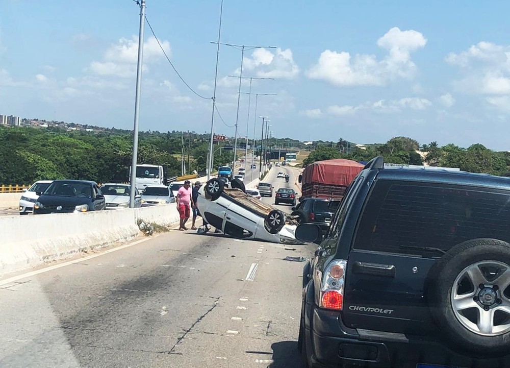 Um carro capotou na manhã desse domingo (29) em cima da ponte Newton Navarro, que liga a Zona Leste à Zona Norte de Natal. O acidente aconteceu na descida, no sentido Praia do Forte/Redinha, e deixou o trânsito lento no local.