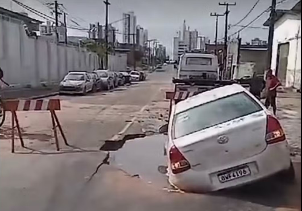 Um carro foi engolido por uma cratera na Avenida Miguel Castro, em Natal, na madrugada deste domingo (2). O buraco se abriu após o rompimento de uma tubulação de água na via, próximo à Rua dos Caicós.