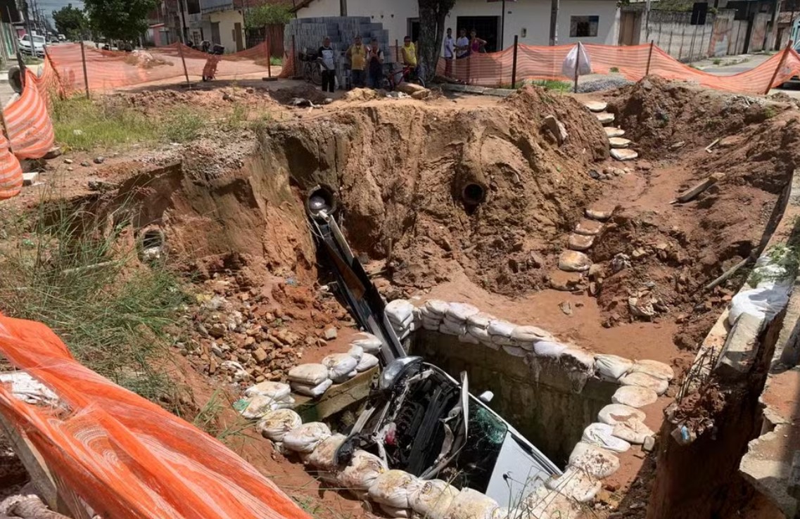 O carro derrubou as manilhas e faixas de isolamento e caiu no buraco. Moradores da região pularam na cratera para socorrer o condutor, que não foi identificado.