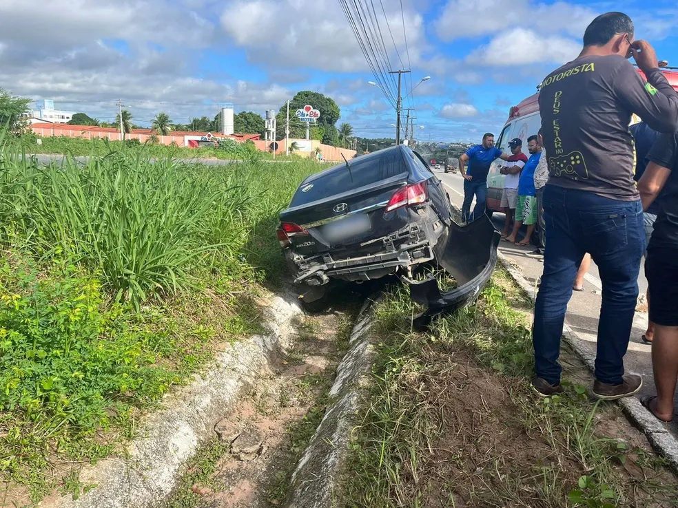 Um carro que freou para parar atrás de outro em uma faixa de pedestres na BR-406, no sentido de Natal e Ceará-Mirim, foi atingido por um terceiro veículo e acabou caindo em uma vala no canteiro central da via. O caso aconteceu na manhã desta quarta-feira (14) na altura do quilômetro 170.