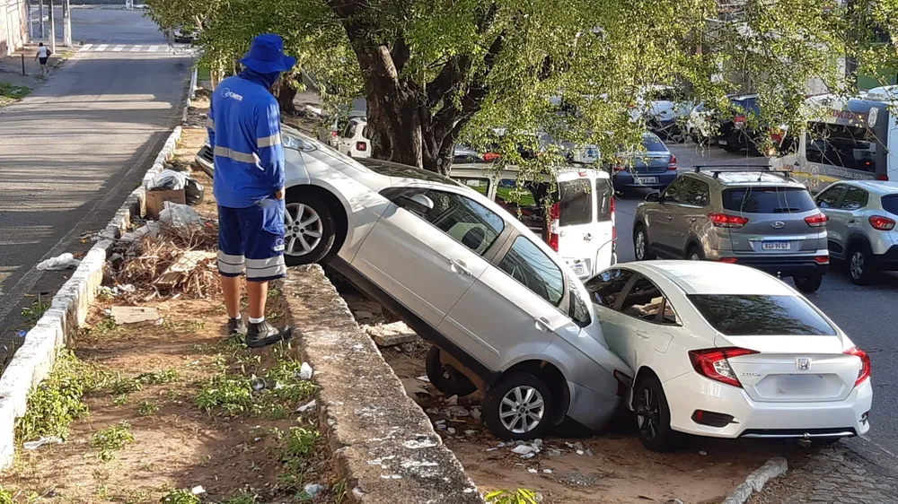 Um carro sem motorista desceu uma ladeira, atravessou parte da avenida Romualdo Galvão e caiu do canteiro central da via atingindo outro veículo que estava estacionado.