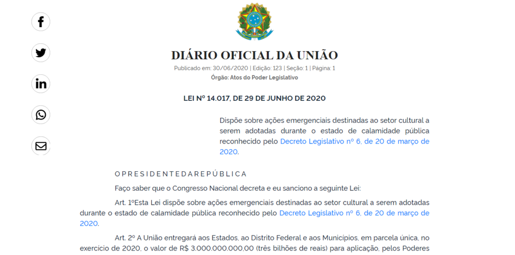 Mais uma conquista aos cofres municipais fruto do trabalho da Confederação Nacional de Municípios (CNM)! Foi sancionada na segunda-feira, 29 de junho, a Lei 14.017/2020 que dispõe sobre ações emergenciais destinadas ao setor cultural a serem adotadas durante o estado de calamidade pública. A medida, denominada de Lei de Emergência Cultural Aldir Blanc, foi bastante comemorada […]