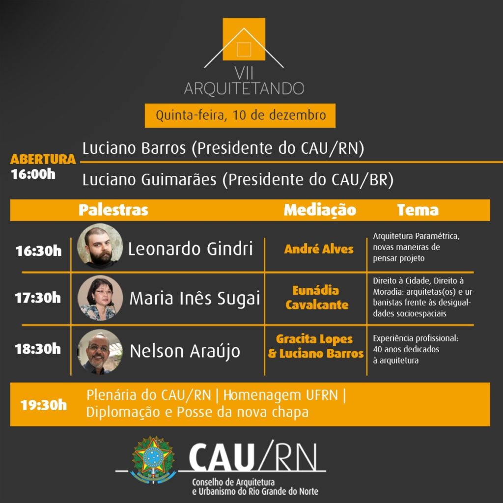 O Conselho de Arquitetura e Urbanismo do Rio Grande do Norte – CAU/RN realiza o VII Arquitetando no dia 10 de dezembro, às 16h. A novidade deste ano é que o evento acontecerá de forma on-line e irá trazer nomes do cenário nacional da Arquitetura, como: Leonardo Gindri, Maria Inês Sugai e o potiguar, Nelson […]