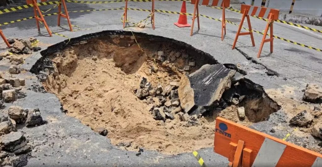 Cratera se abre em rua na Zona Leste de Natal; duas linhas de ônibus mudam rota
