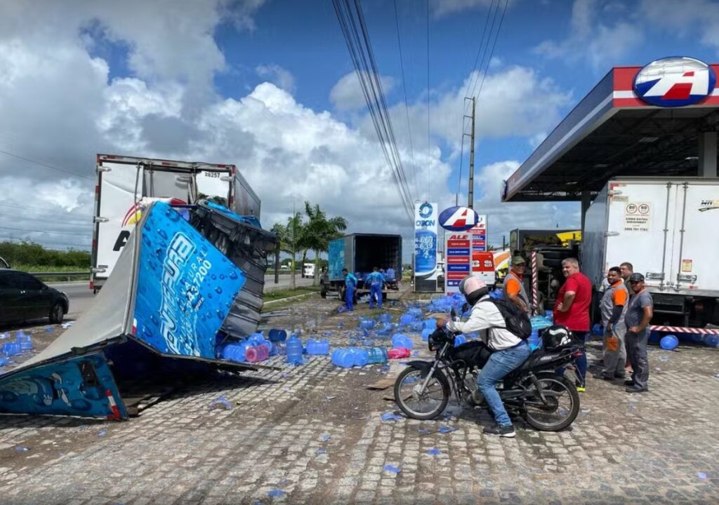 Caminhão carregado de garrafões de água tomba e invade posto de combustíveis na Grande Natal; veja vídeo