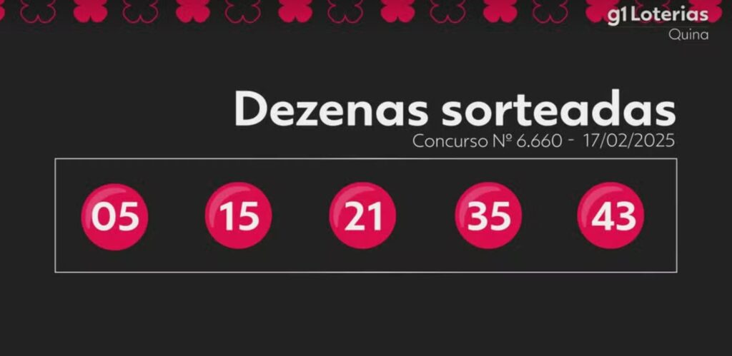 Veja abaixo os números do sorteio do concurso 6660 da Quina realizado nesta segunda-feira (17): 5 – 15 – 21 – 35 – 43 Veja quantas apostas foram premiadas no concurso 6660: 5 acertos: 1 aposta ganhadora, que vai receber R$ 24.186.857,34; 4 acertos: 137 apostas ganhadoras, cada uma vai receber R$ 5.903,38; 3 […]