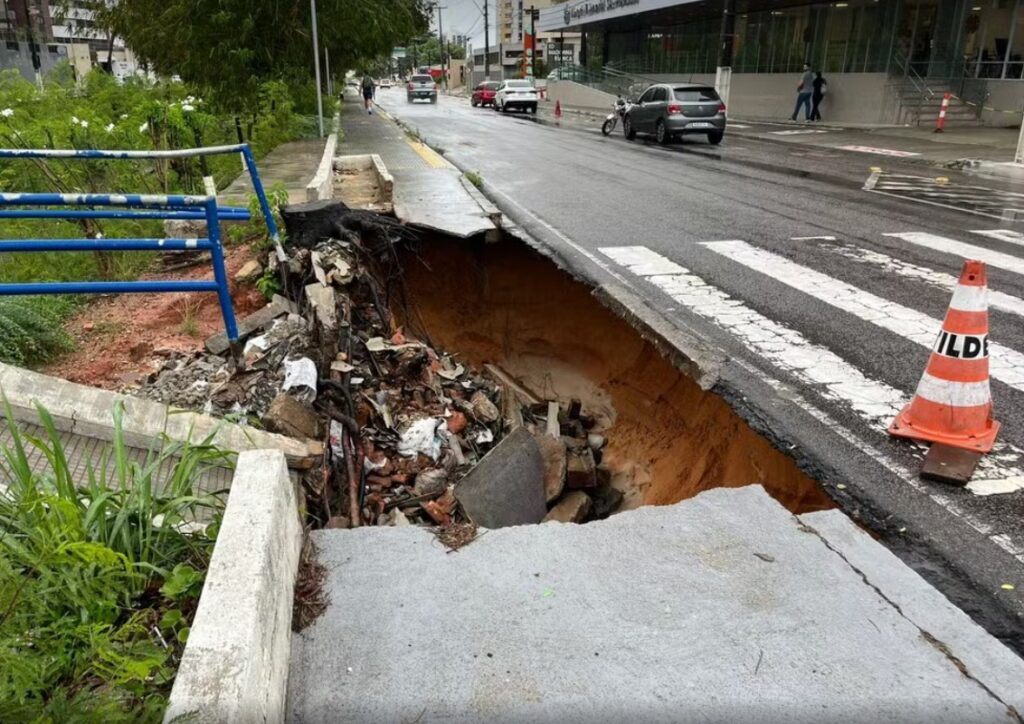 Cratera, queda de árvores e alagamentos: Natal registra mais de 90 mm de chuva em 12 horas