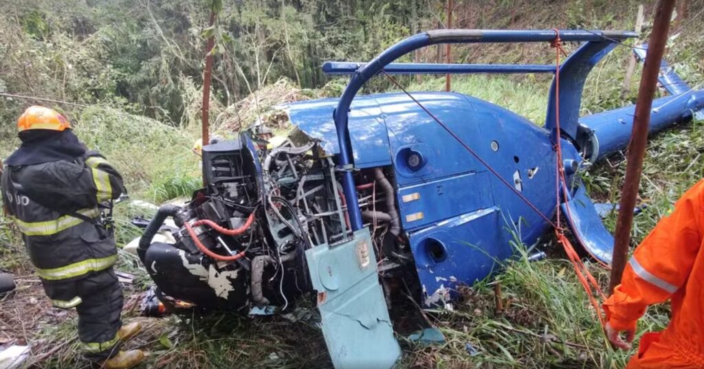 Helicóptero cai na Grande SP e duas pessoas morrem; uma adolescente e o piloto são resgatados com vida