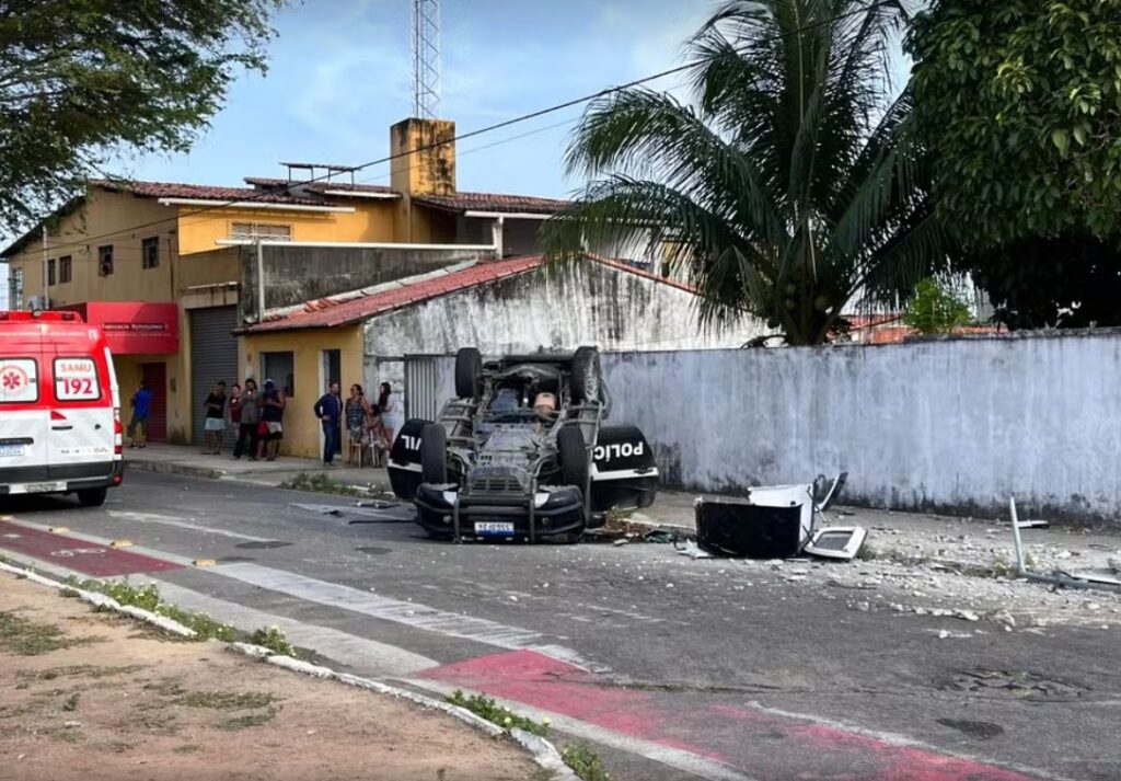 Viatura da Polícia Civil capota após bater em ônibus e preso morre em Natal