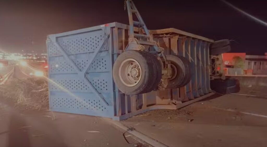 Trecho da BR-101 passa duas horas interditado após semirreboque carregado com cana de açúcar tombar no RN