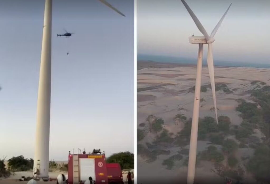 Trabalhadores ficaram presos a 80 metros de altura após incêndio em torre eólica no RN