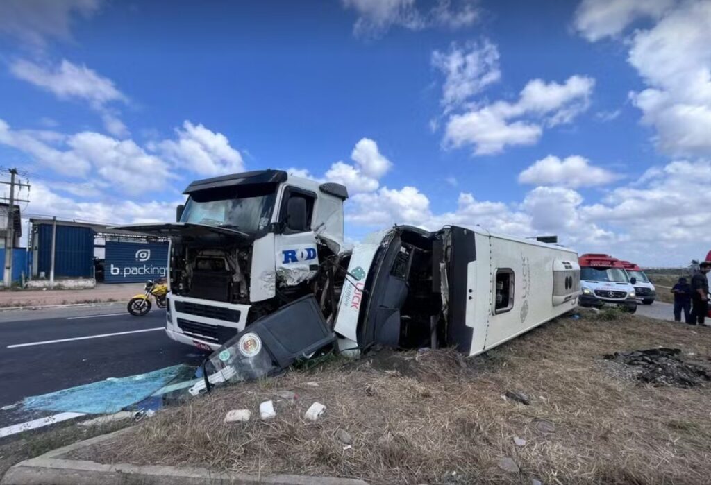 Pelo menos 12 turistas ficam feridos em acidente entre caminhão e micro-ônibus na Grande Natal