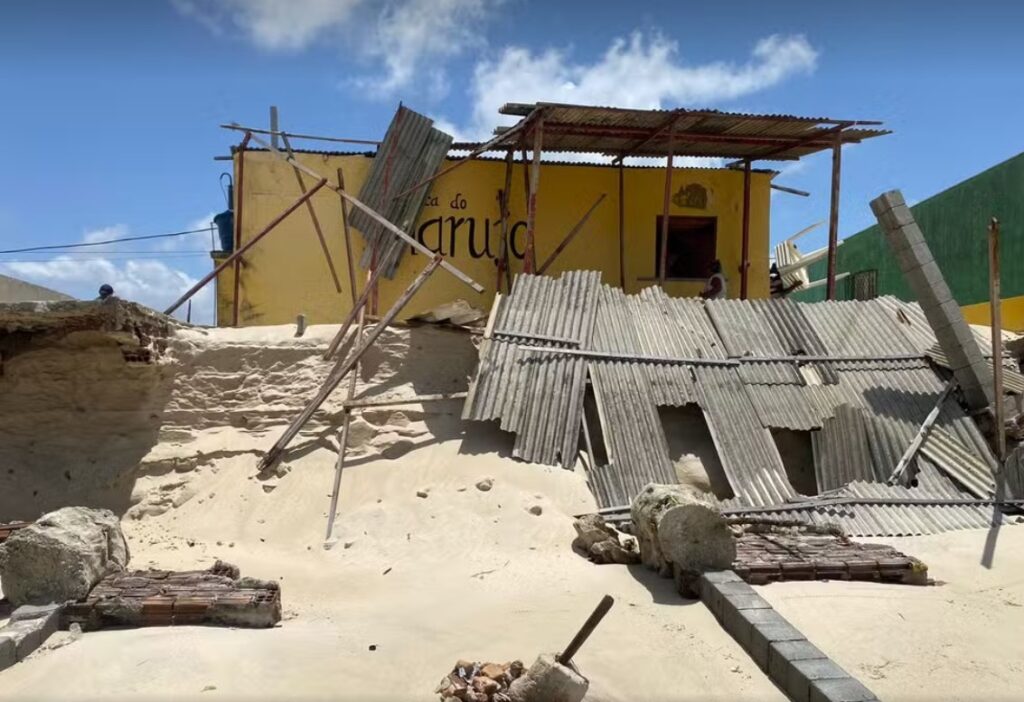 Maré sobe e destrói quiosques na praia de Redinha Nova, em Extremoz