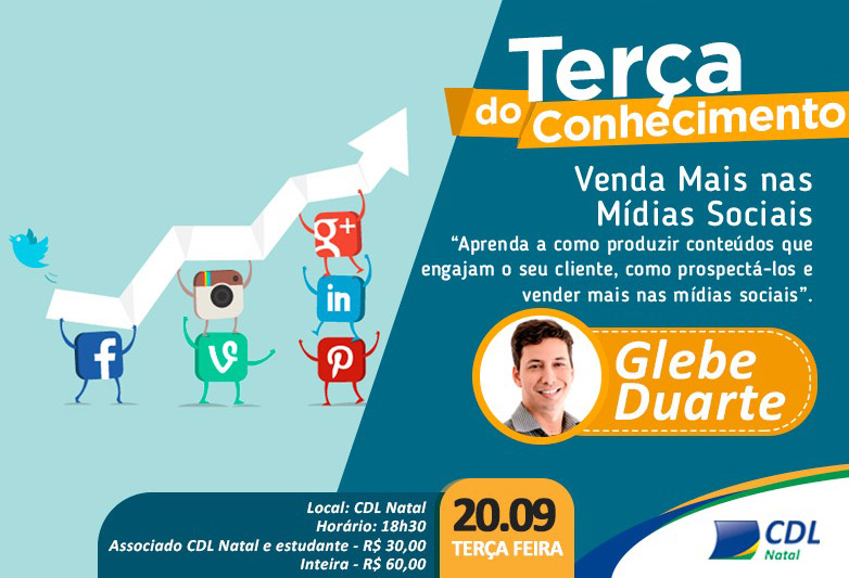 Hoje às 19hs, a CDL Natal terá mais uma edição da Terça do Conhecimento. Dessa vez o assunto são as mídias sociais. O convidado desta edição é o consultor em Marketing Digital Glebe Duarte com a palestra “Venda Mais nas Mídias Sociais”. Glebe Duarte é consultor em Marketing Digital, foi Coordenador dos cursos de Informática e Comunicação no SENAC-RN, por 6 anos, foi presidente da ABRADi-RN (Associação Brasileira de Agências Digitais no RN), diretor de web nas agências Fácil Comunicação e RAF Comunicação. Ministra cursos e palestras na área de Marketing Digital desde 2011, já tendo ministrado cursos em Natal, Recife, São Paulo e Porto Alegre. Foi professor convidado do MBA de Mídias Digitais da UnP e Estácio.
