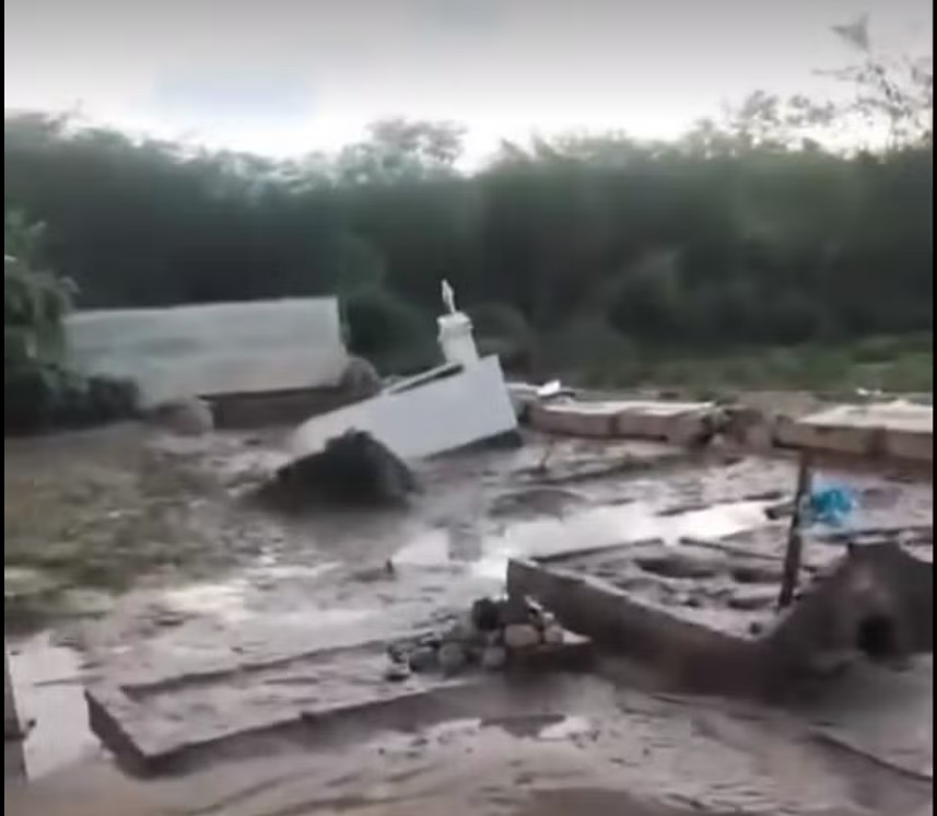Um cemitério público na cidade de Pedra Preta, no interior do Rio Grande do Norte, ficou destruído após um rio transbordar neste domingo (31). O cemitério fica numa comunidade chamada de Salgadinho.