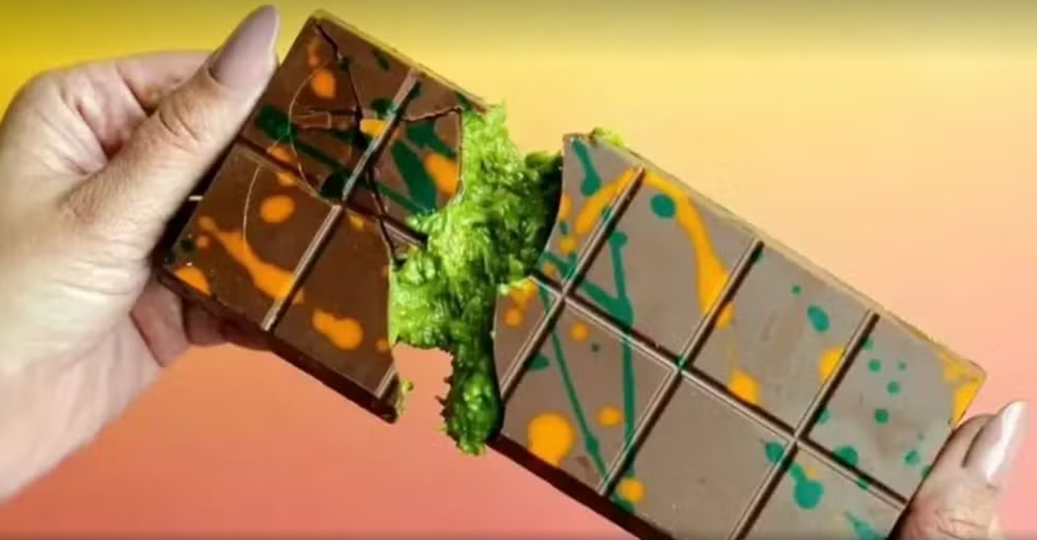 A aparência da barra parece feita sob medida para as redes sociais — desde as manchas atraentes em laranja e verde sobre o chocolate ao leite liso até o som crocante que ela faz ao ser quebrada.