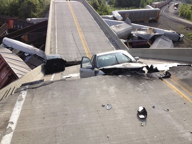 O choque entre dois trens de carga em uma interseção de trilhos deixou sete feridos neste sábado (25) no condado de Scott, no estado americano do Missouri. O incêndio causado pelo choque provocou a queda do viaduto sobre a qual eles viajavam, segundo a polícia. O despachante Clay Slipis, do gabinete do xerife do Condado de Scott, disse que cinco pessoas que viajavam em carros no viaduto ficaram feridas, assim como os dois condutores dos trens, perto da cidade de Chaffee, no sudeste do Missouri.