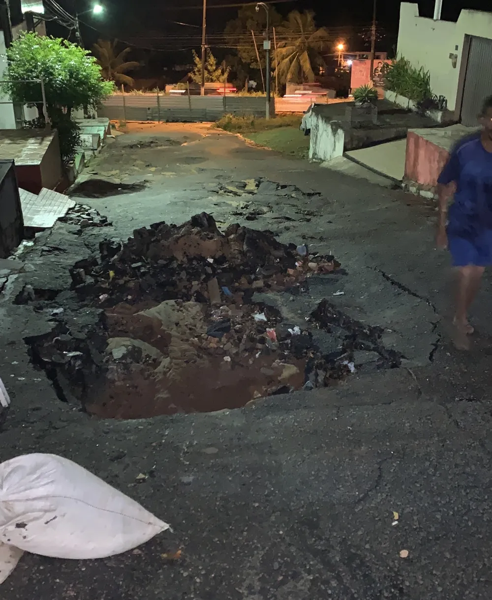 Na tarde desta quarta, funcionários contratados pela Companhia de Águas e Esgotos do RN (Caern) colocaram sacos de areia no trecho, que é uma ladeira, para impedir que a água desça em direção à cratera caso a chuva volte. Há ainda um cavalete para indicar o problema no local.