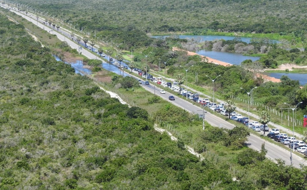 Uma longa fila de veículos se formou por causa de um alagamento na Rota do Sol em Natal, na manhã deste domingo (12). Após as fortes chuvas que caíram na capital ao longo do sábado (11), uma lagoa se formou na região, dificultando a passagem dos motoristas que trafegavam pela via.