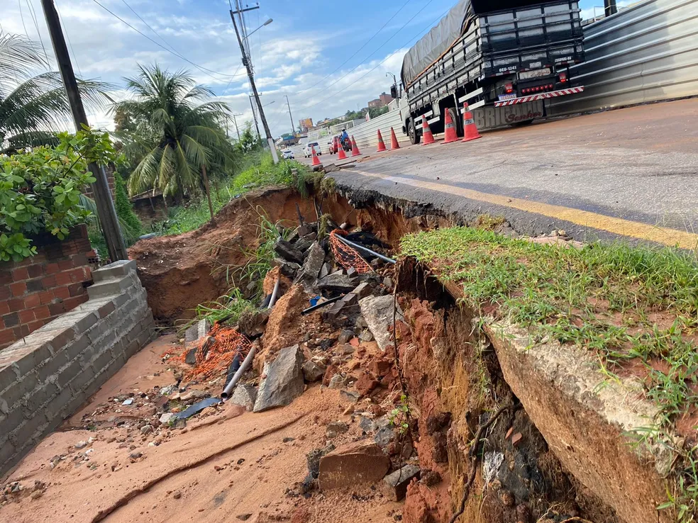 As fortes chuvas que caíram na noite de domingo (26) em Natal fizeram ceder a terra à margem da avenida Felizardo Moura, próximo à Ponte de Igapó. A situação afeta o trânsito e também a rotina de pessoas que moram no local.