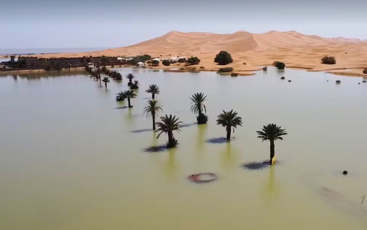 Uma chuva excepcional formou lagoas entre as palmeiras e as dunas do deserto do Saara, trazendo umidade para uma das regiões mais áridas do planeta.