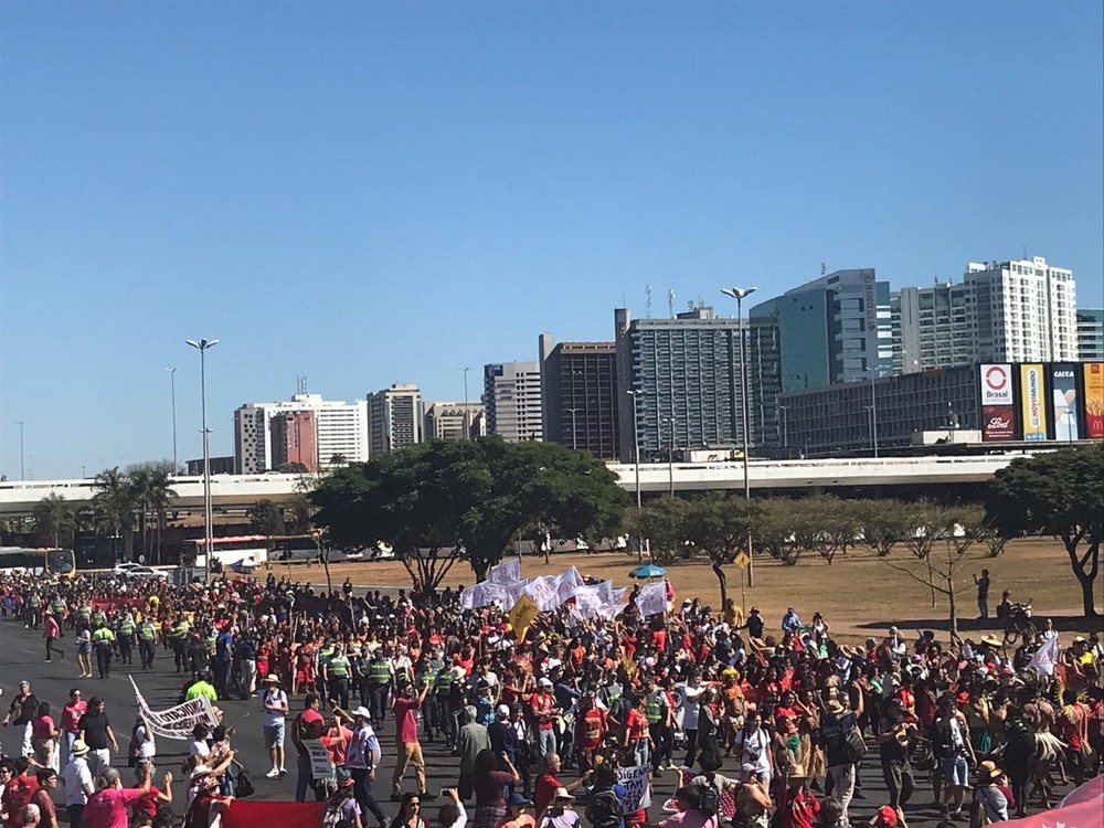 No DF, professores, estudantes e lideranças indígenas de todo o país se reuniram na Esplanada dos Ministérios, área central de Brasília, para protestar contra os cortes da educação e contra a reforma da Previdência. Mais cedo, manifestantes fecharam três faixas da Estrada Parque Núcleo Bandeirante (EPNB) com pneus em chamas, o que causou engarrafamento antes das 7h.