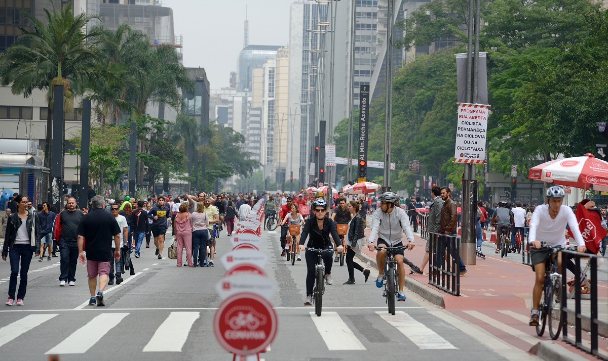 SAO PAULO, BRAZIL - NOVEMBER 15 : Paulista avenue on Sunday where the city autorities close it off to traffic to allow citizens to cycle or jog on November 15, 2015 in Sao Paulo, Brazil. (Photo by Frédéric Soltan/Corbis via Getty Images)