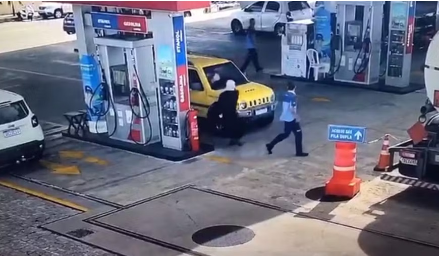 As imagens de câmeras de segurança mostram o momento em que o assaltante sai de um carro branco, com arma em punho e com o rosto coberto com uma máscara. O homem abordou um frentista, tomou cerca de R$ 30 e se aproximou de outro carro de cor amarela para abordar outras pessoas.