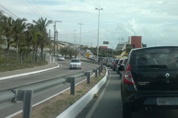 Segundo condutores, uma batida entre dois carros, Ford Ka e Agile, deixa aproximadamente uma faixa para fluxo dos veículos nesse sentido. Devido ao acidente, retenção de veículos também influencia trânsito na Roberto Freire. O Comando de Polícia Rodoviária Estadual (CPRE) afirma que ainda não tinha conhecimento sobre algum acidente e que o congestionamento ocorre semanalmente no retorno das praias após fim de semana. Devido ao problema no fluxo, duas motos do CPRE foram enviadas ao local para orientação do trânsito. As mesmas unidades podem atender e registrar possíveis acidentes.