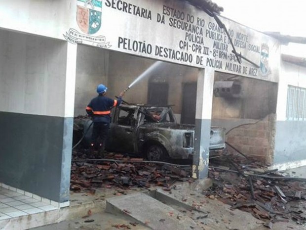 O Pelotão Destacado da Polícia Militar na cidade de Arez, região Leste do Rio Grande do Norte foi atacada por criminosos na madrugada desta quarta-feira (1º). De acordo com o capitão Cláudio Henrique, comandante do policiamento militar no município, o prédio e uma viatura foram incendiados. Dois suspeitos foram presos.