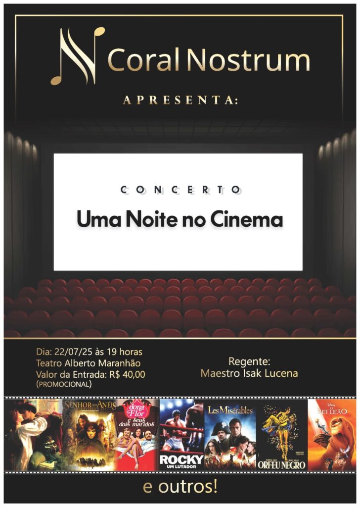 Na próxima terça-feira (22) o Teatro Alberto Maranhão será palco de um evento de trilha sonora com “Uma Noite no Cinema – Coral Nostrum”. O evento terá regência do maestro Isak Lucena e em seu programa estarão trilhas sonoras que marcaram gerações, com arranjos inéditos e grandes músicos convidados.