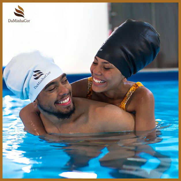 A DaMinhaCor oferece toucas natação para quem possui cabelos afro. Como a própria chamada da marca diz, não é só uma touca, no entanto – trata-se de representatividade. Afinal, para mais da metade da população brasileira, potencialmente seus cabelos, se grandes, simplesmente não cabiam nos modelos disponíveis, para poderem nadar.