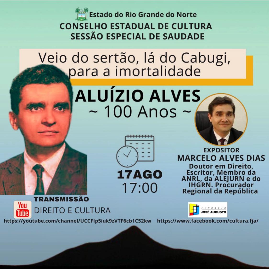 O jornalista e escritor Aluízio Alves, que ocupou a Cadeira 17 da Academia Norte-rio-grandense de Letras, terá a sua memória reverenciada ao ensejo do centenário do seu nascimento, em sessão telepresencial do Conselho Estadual de Cultura, hoje (17), às 17 horas. Falará o escritor Marcelo Alves Dias de Souza, também integrante da ANRL. Transmissão pelo YouTube, Canal Direito e Cultura, link: https://youtube.com/channel/UCCFIp5iuk9zVTF6cb1C52kw