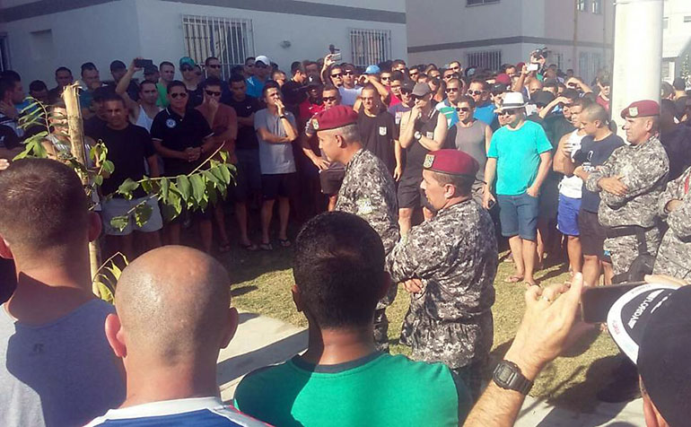 Um vídeo mostra dezenas de militares protestando no condomínio residencial e um comandante tentando controlar a insatisfação dos presentes. Um servidor, que não se identificou, disse que os agentes também temem pela segurança pessoal, pois o condomínio, construído pelo Programa Minha casa, Minha vida, está localizado perto de favelas comandadas por traficantes e milicianos. Eles também reclamaram da carga horária de 60 horas semanais, em escala de 12 horas por 24h.