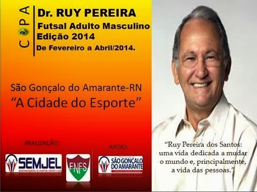 A Secretaria de Juventude, Esporte e Lazer de São Gonçalo do Amarante vai iniciar a Copa Dr. Ruy Pereira de Futsal Adulto Masculino – Edição 2014. A competição terá início na noite desta quinta-feira (20), no ginásio de esportes Senador Luiz de Barros, localizado na comunidade de Santo Antônio do Potengi, a partir das 19h. A competição tem a realização da Federação Norte-riograndense de Futebol de Salão com apoio da Prefeitura Municipal de São Gonçalo do Amarante. Na rodada dupla de abertura da fase classificatória vão se enfrentar Portugual x Abençoados e Os Plays x Serrada FC.